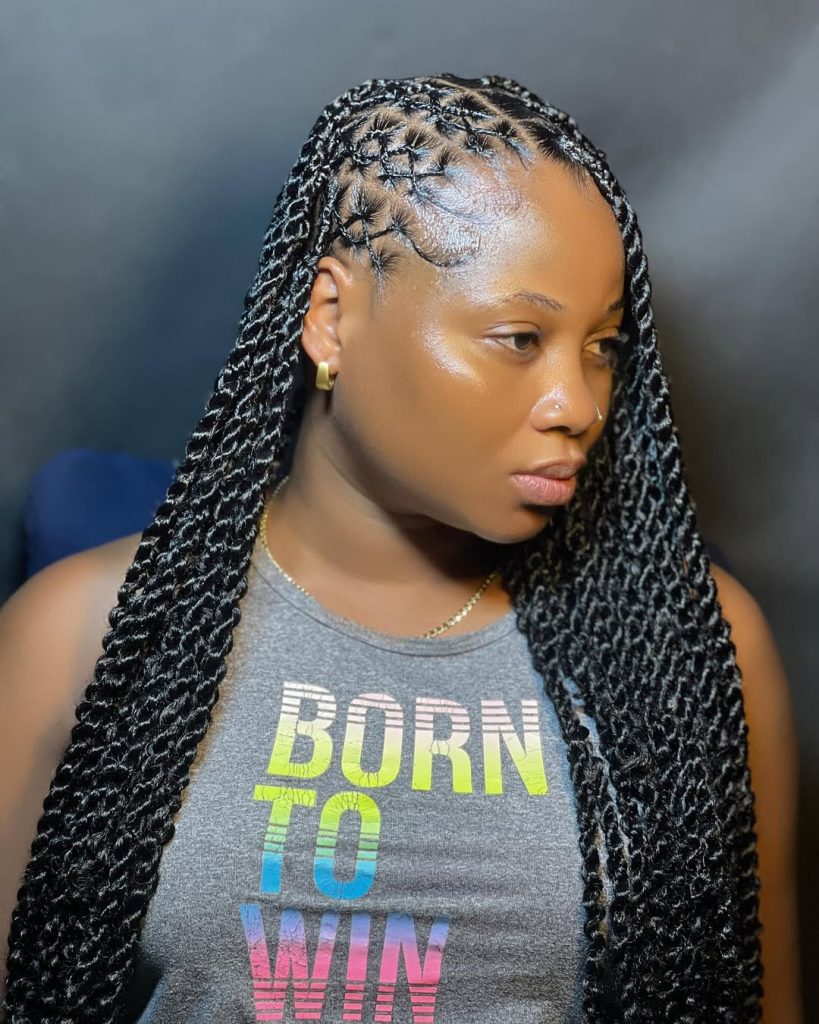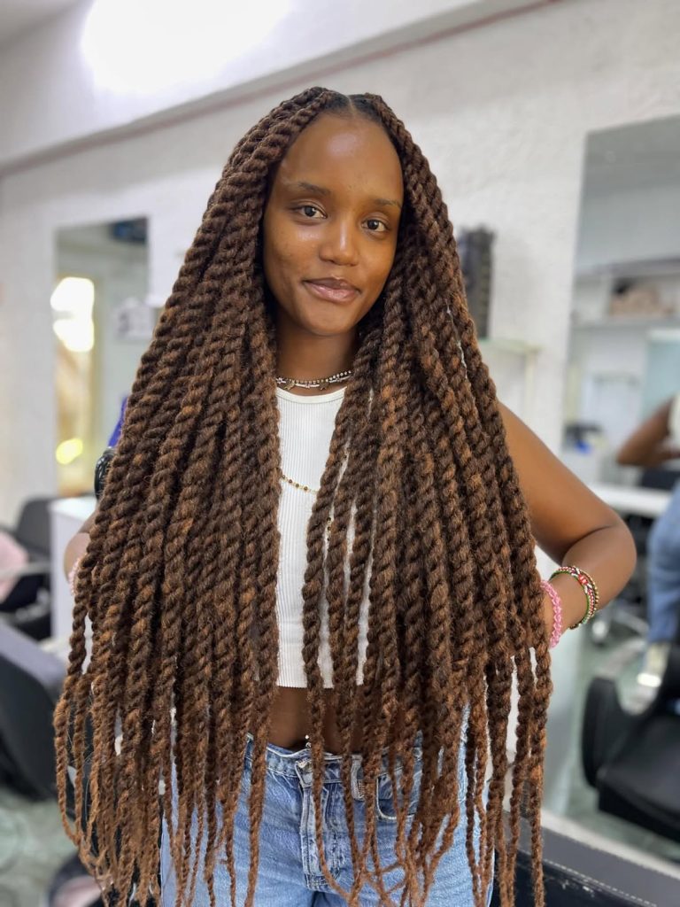 This protective Twist look is perfect if you want something that truly makes a statement and can Last long with proper care. Because twists are generally lighter than some traditional braid installs, they can feel more comfortable for extended wear. Keep your scalp moisturized and wrap it at night to maintain shine and neatness. It’s protective, expressive, and unapologetically glamorous.