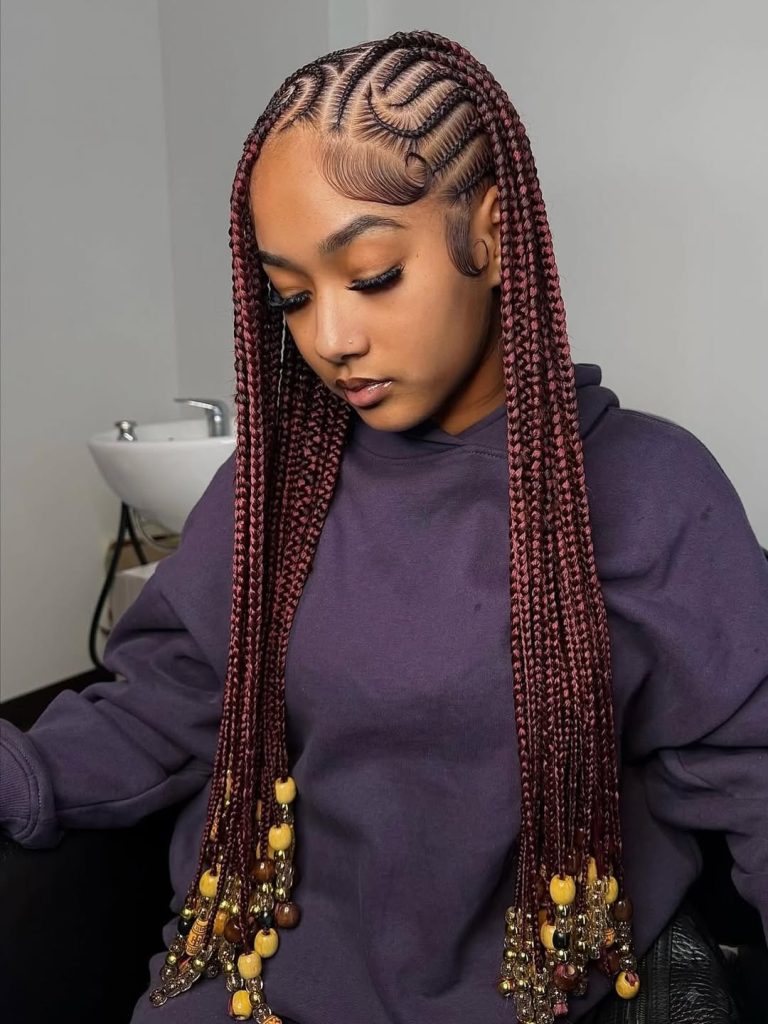 There’s something so captivating about deep burgundy braids paired with decorative beads. The detailed Braids cornrow pattern at the scalp creates a beautiful design, while the sleek, extended length gives this look dramatic flair. The added beads bring personality and movement, making the style feel expressive and unapologetically bold.