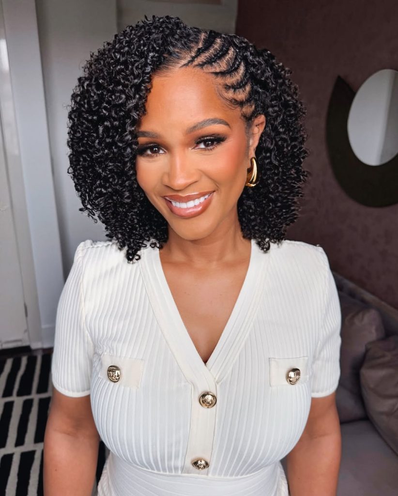 This style is perfect for women who want protective options that still feel feminine and versatile. The braid foundation helps it. Lasts long, while the curls can be refreshed with a little mousse and finger definition. It’s a beautiful choice if you love braided cornrow kinky twist hairstyles but want extra softness and bounce through the lengths.