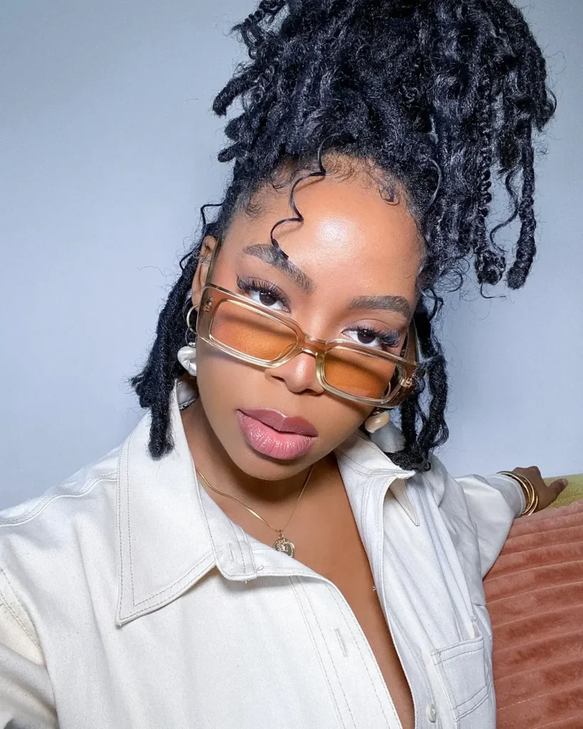 This protective updo is ideal if you want a low-tension style, which means it minimizes stress on the hair and scalp while keeping your ends tucked and secure. It’s perfect for natural 4c textures, it’s Quick to refresh and surprisingly versatile. When paired with statement glasses or gold jewelry, it creates a modern and self-assured look. Sometimes the right updo is all the inspiration you need to try something new.