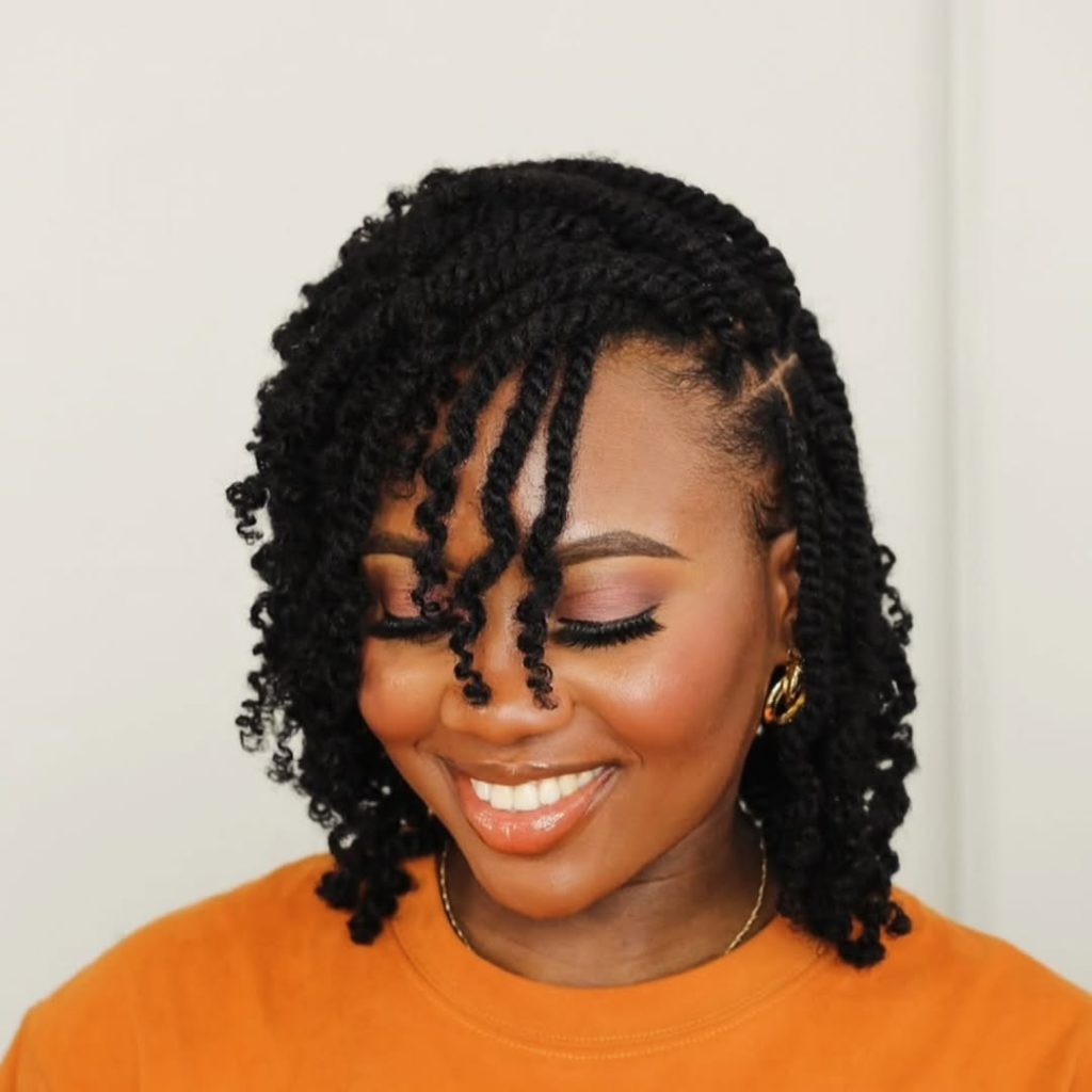 If you’re looking for short, easy-to-wear curly hairstyles, this one meets all your requirements. The twisted texture offers a low-tension option for natural hair, and the shorter length makes it quick to refresh in the morning. It’s Cute, modern, and ideal for women who want protective styling that still feels effortless and has personality.