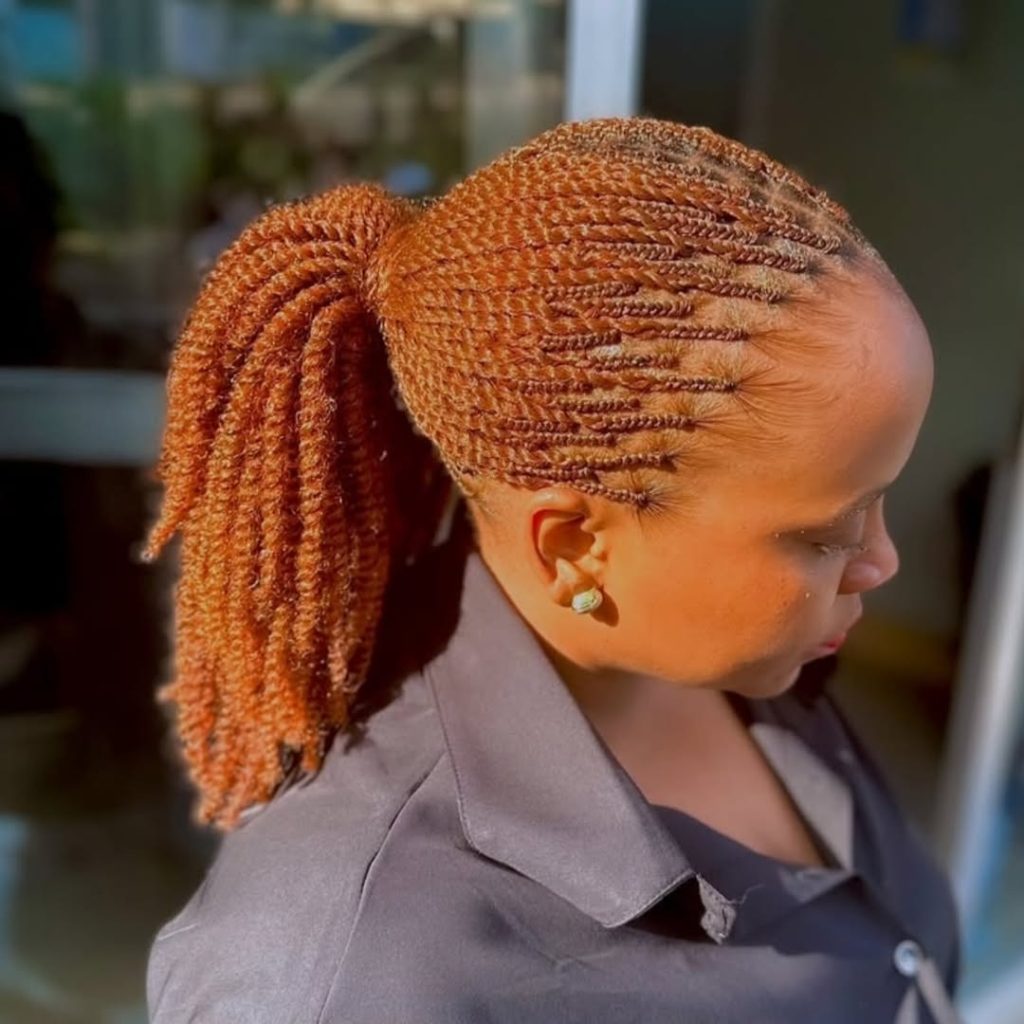 There’s something undeniably magnetic about long honey-brown twists cascading over the shoulders. The blend of warm caramel and deep brown tones gives this look softness and dimension, while the defined spiral ends add that touch of glam we all secretly love. This style exudes a feminine, polished, and powerful vibe, transforming a simple black top into a striking statement. These braided cornrow and kinky twist hairstyles have that effortless confidence that says, “I take care of my crown.”