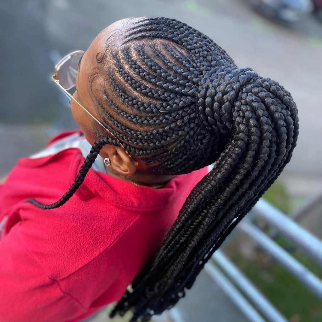 A sleek ponytail built from neat cornrow braids has such clean, confident lines. The carefully parted pattern at the scalp creates beautiful detail, while the gathered ponytail keeps everything tidy and controlled. It feels sporty yet polished—like a style that works just as well at work as it does on a casual day out.