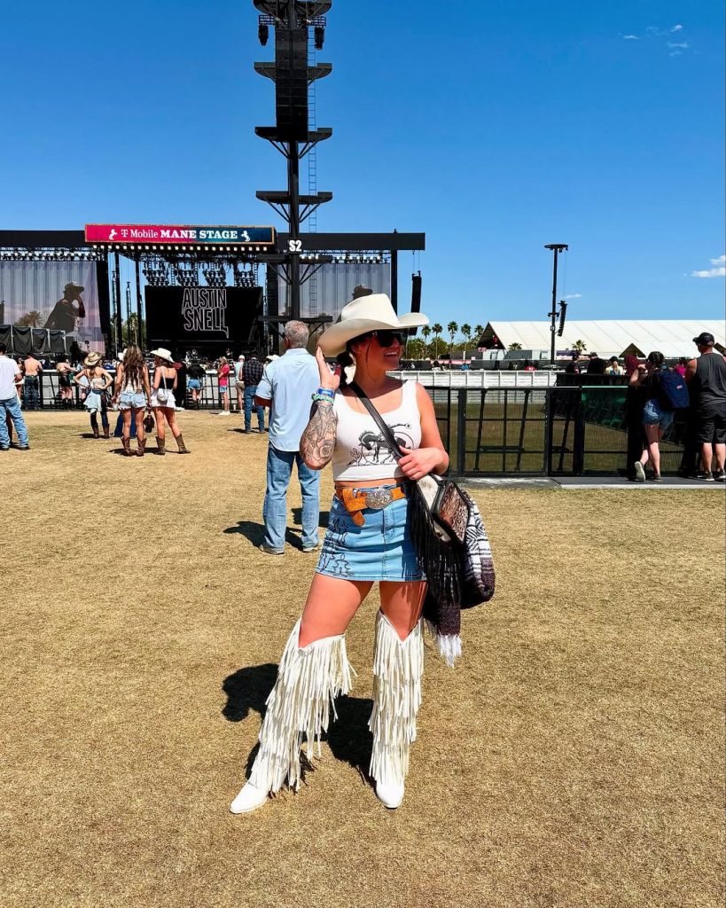 This look is pure Western country cowgirl fashion energy—the kind of outfit that makes you feel instantly confident the moment you step onto the grounds. The denim skirt paired with the bold white fringe leg covers creates that adorable but baddie vibe rodeo girls love, while the graphic tank and cowboy hat keep it casual and Texas-approved. It’s the kind of carefree summer moment that reminds you why dressing up for a rodeo is half the fun.