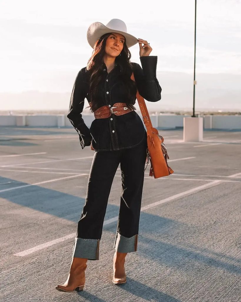 There’s something so classy about a dark denim set done right—especially when the sun hits it just enough to give everything that warm glow. This look blends chic structure with a casual Western attitude, and the wide white hat softens the whole outfit beautifully. The bold leather belt adds that touch of Western country cowgirl fashion that feels instantly stylish for 2026.