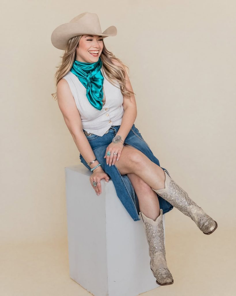 Here’s that bold Western country cowgirl fashion moment—playful, lively, and ready for a summer night out. The tie-printed shirt gives off a vintage-meets-Mexican rodeo influence, while the wide-brim hat adds balance and attitude. It’s cute, confident, and perfect for anyone who loves a little flair.