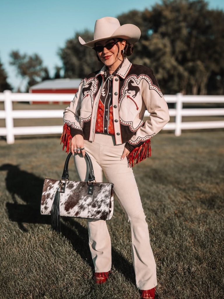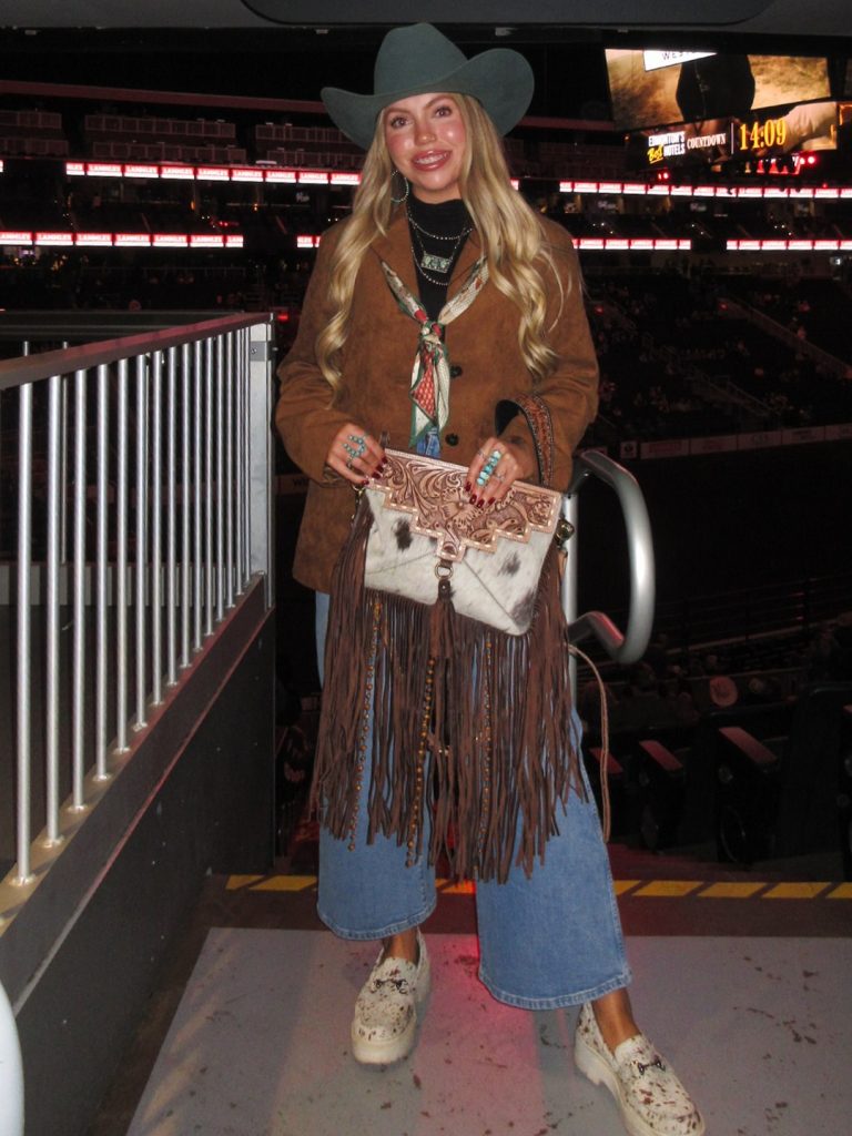 What makes this outfit special is the mix of textures: fringe, suede, denim, and the tooled leather bag all work together to create a rich Western story. It’s a great choice for winter or fall rodeos when you need warmth but still want to feel chic and put-together for a party or night event.