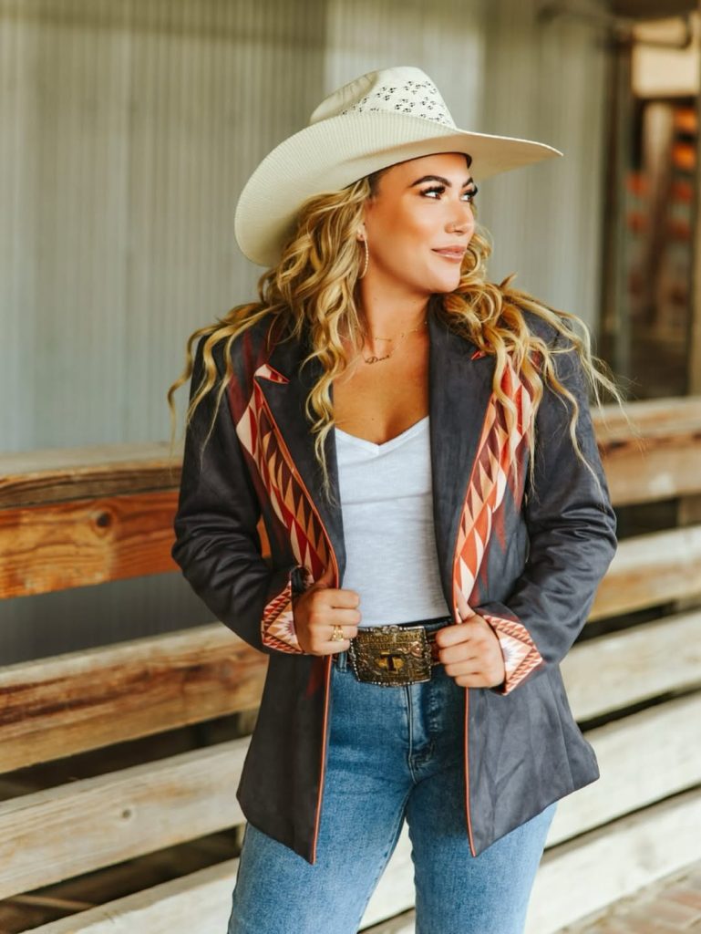 There’s something effortlessly chic about a woman who blends Western country cowgirl fashion with a touch of classy polish. This look feels casual but still sharp, thanks to the patterned blazer and soft waves under the cowboy hat. It has that Texas-meets-modern vibe—bold without trying too hard, cute without being cutesy, and perfect for a cool fall rodeo evening.