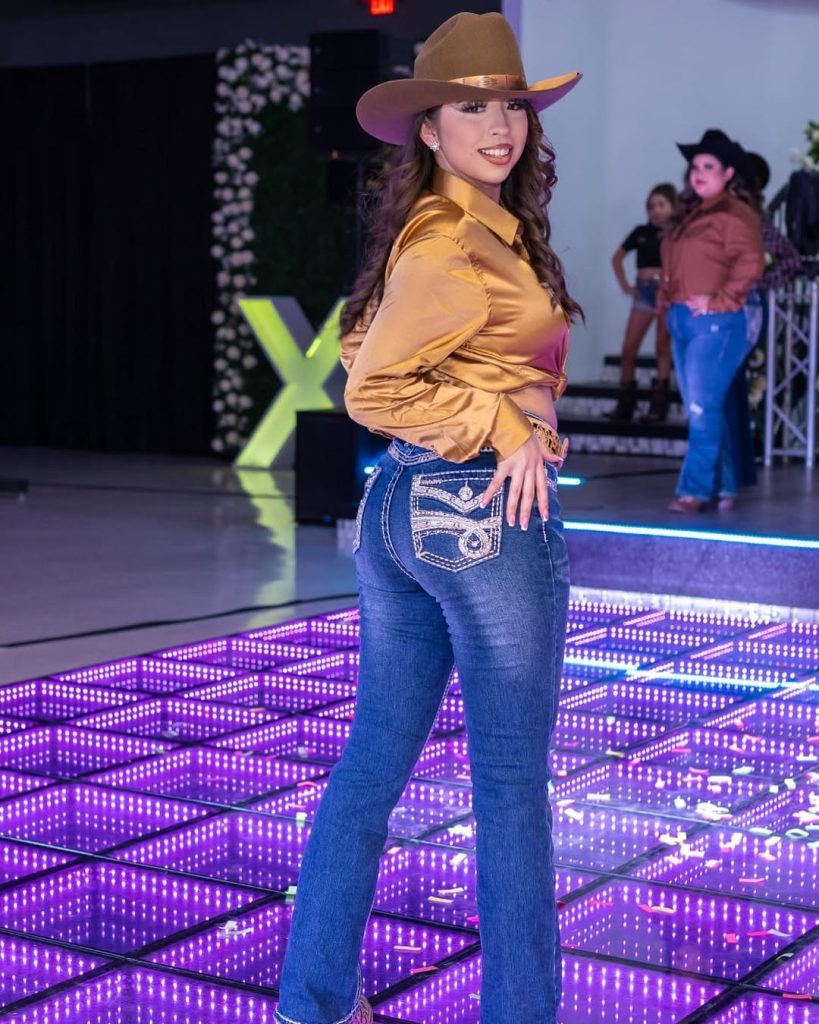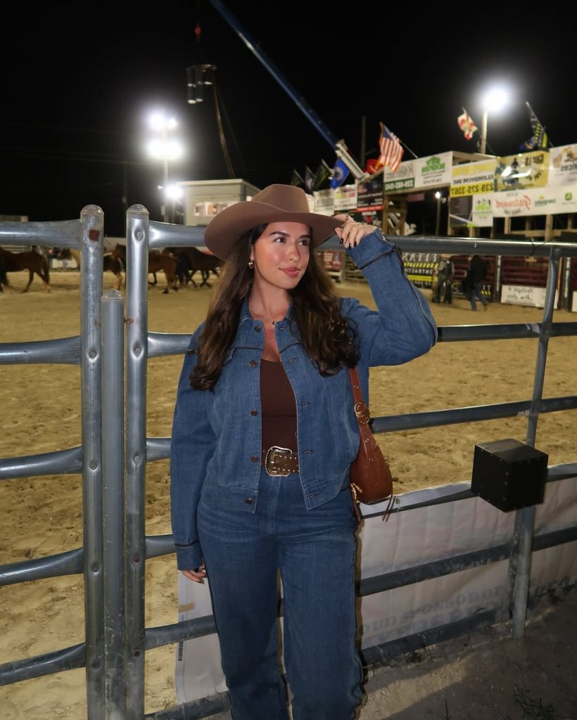 What makes this cut truly unique is the sharp denim tailoring paired with the cuffed pant legs, giving the outfit shape without feeling too stiff. It’s great for fall evenings or slightly cold rodeo nights when you want to stay comfy but polished. Pair with brown boots or black boots depending on how bold you want the contrast.