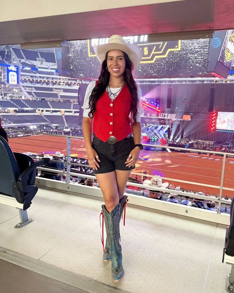 This outfit is pure fun—a sparkly top paired with a Western-print skirt and classic cowboy hat, creating a cute mix of rodeo energy and party-night confidence. The longer boots keep it Texas-ready, while the skirt adds a pop of personality that feels fresh for 2026. It’s the kind of look that makes you smile as soon as you put it on.