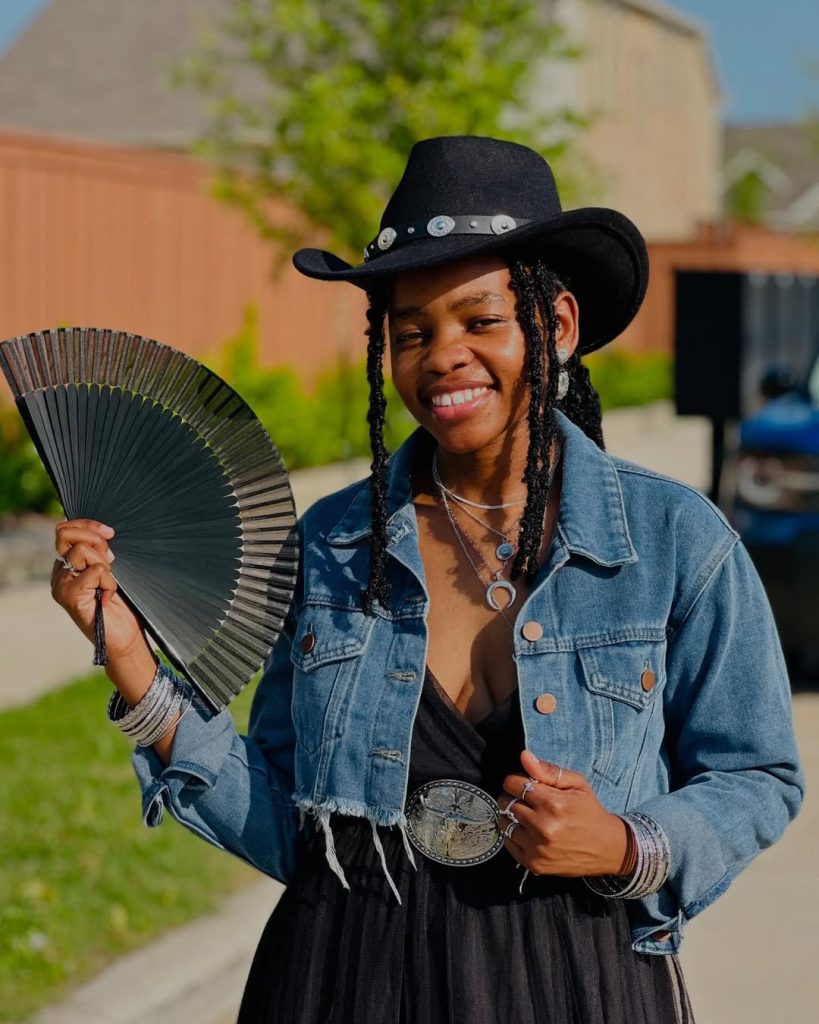 This outfit is the perfect blend of black elegance and Western charm. The denim jacket keeps it casual and comfy, while the all-black base adds a classy edge. It’s the kind of look that works for any season—warm spring afternoons, breezy fall days, or even winter when layered right. The hat gives it that true Texas feel without being over the top.