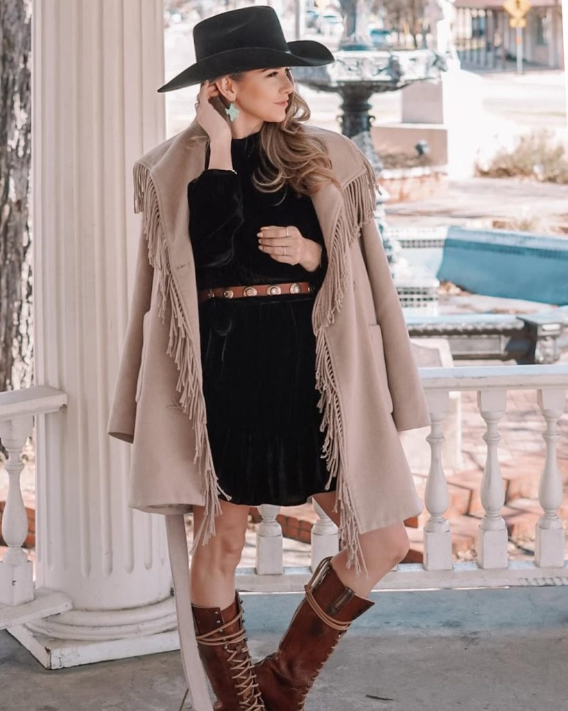 This outfit brings that classy Western sophistication—a black dress layered with a fringe coat that drapes beautifully and feels perfect for a winter rodeo or a dressier event. It has that subtly glamorous touch without being over the top, and the tall lace-up boots add just the right amount of Texas edge. It’s modern, chic, and powerful in the most effortless way.