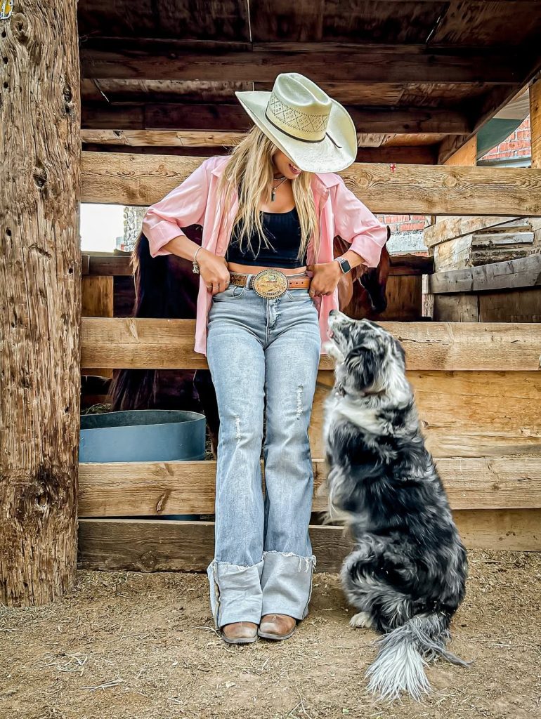 This outfit has such a sweet, relaxed Western feel—the oversized pink shirt, engraved belt buckle, and light-wash jeans come together in a way that feels casual, cute, and effortlessly feminine. It’s exactly the kind of look you reach for when you want comfort but still want that rodeo-week energy. The soft color mix gives it a summer or spring charm that feels very 2026.