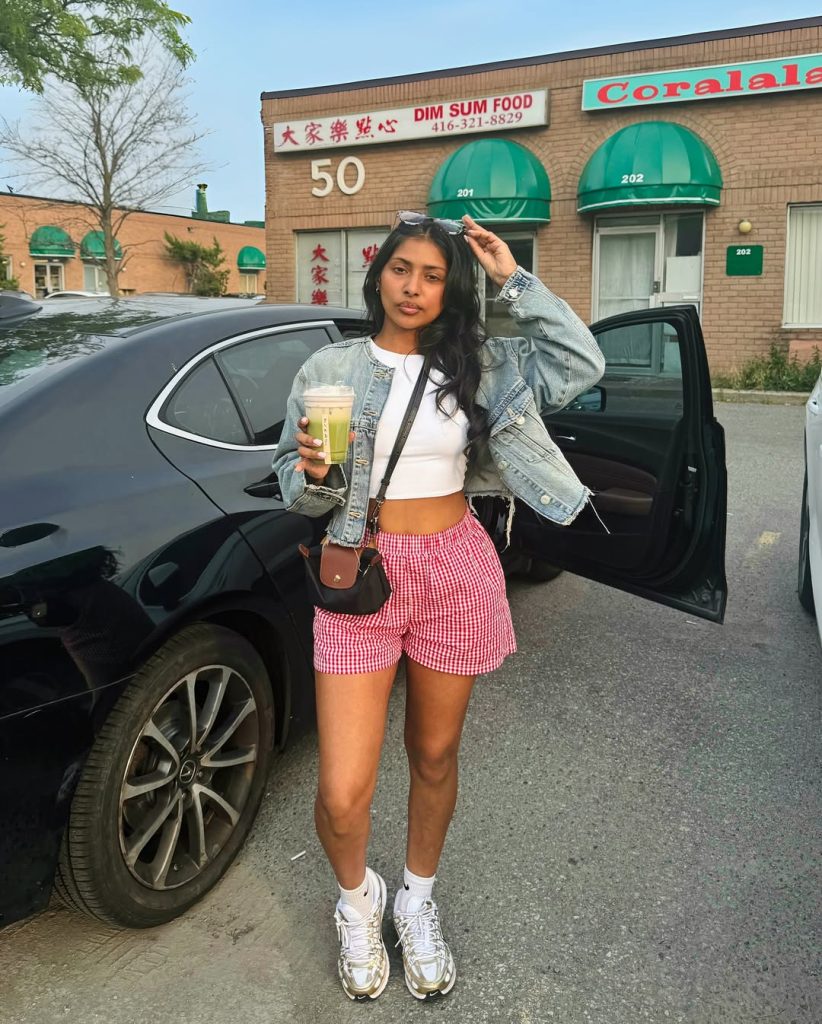 This look brings such a fun burst of energy—the red gingham shorts feel playful, youthful, and full of personality. Paired with a crisp white tank and a relaxed denim jacket, the outfit creates that perfect blend of summer brightness and casual charm. There’s a carefree vibe here, the kind that feels spontaneous and perfect for warm evenings or quick weekend outings.