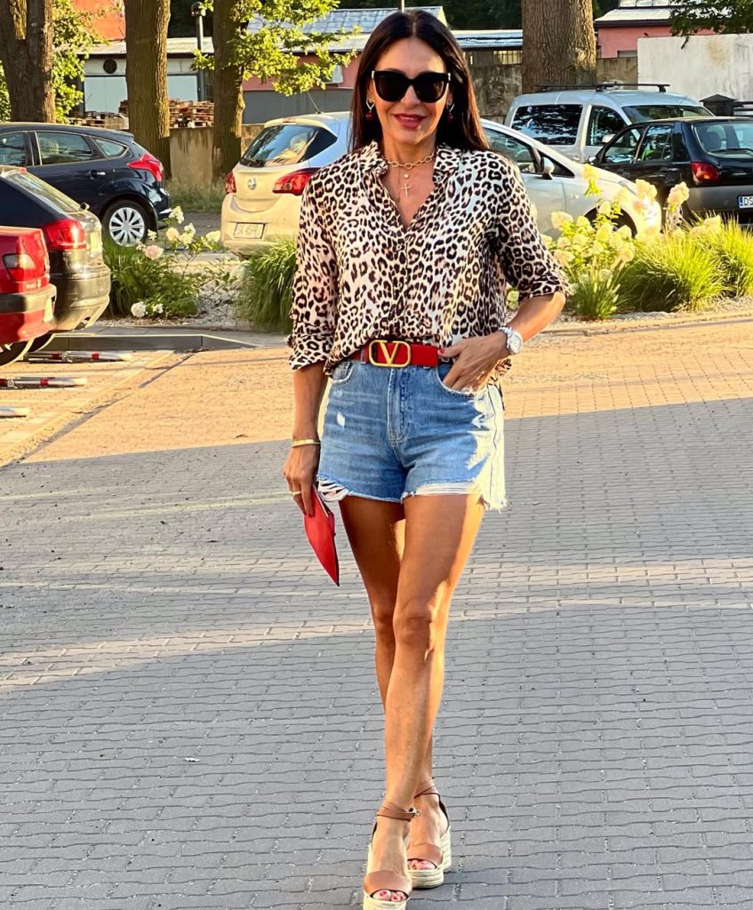 This outfit radiates bold confidence—the kind that comes from mixing a statement print with a timeless denim short. The leopard blouse adds drama and flair, making the overall look feel instantly elevated and perfect for a night out or a fun summer party. Combined with the structured accessories, it becomes a striking, classy outfit that embraces a strong, empowered style.