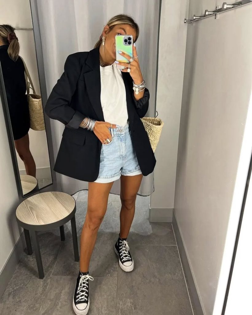 This look has such a cool, urban vibe—the mix of a sharp black blazer with light denim shorts feels modern, effortless, and full of personality. The white tee keeps everything grounded, while the high-top sneakers bring a youthful, casual edge that makes the outfit feel fresh and fun. It’s a style that fits beautifully into 2026’s blend of clean lines and relaxed silhouettes.