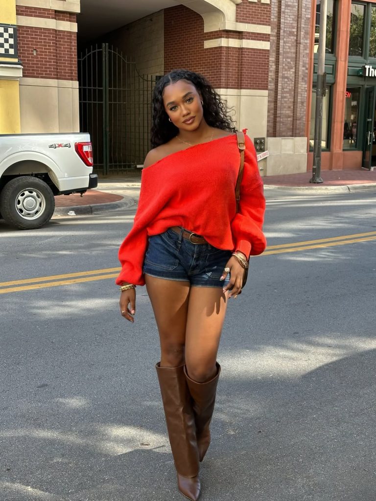 There’s a vibrant confidence in this pairing—the bright red sweater instantly draws the eye and brings warmth, personality, and energy to the entire look. Styled with dark denim shorts and tall brown boots, it feels bold, modern, and full of character. It’s a beautiful example of how color can elevate a simple outfit and make it feel powerful, especially for a Black woman who enjoys expressive and classy style moments.