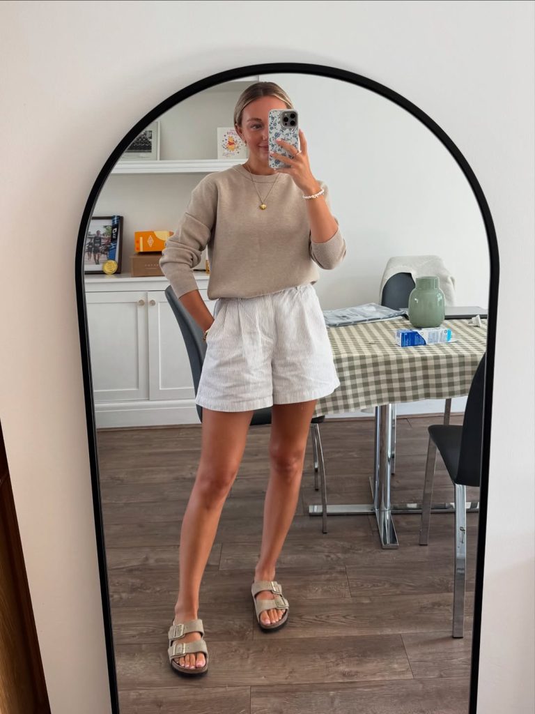 There’s a soft, cozy charm to this look—the neutral knit paired with light striped shorts feels gentle and grounding, perfect for days when you crave simplicity without sacrificing style. It’s unfussy but undeniably put-together, with a relaxed silhouette that’s perfect for slow mornings and easy afternoons at home or out running errands.