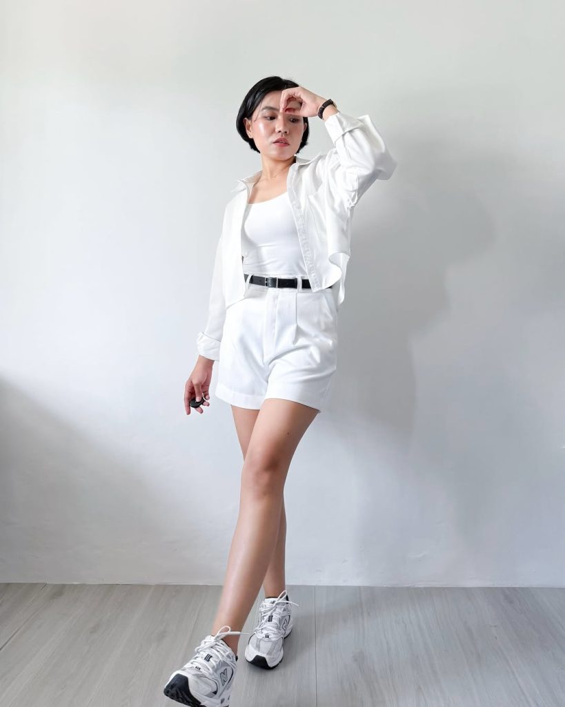 There’s something incredibly fresh about an all-white outfit—crisp, clean, and naturally confidence-boosting. This look blends tailored structure with a sporty edge, creating a modern aesthetic that feels both polished and easygoing. The sharp shorts and cropped shirt add quiet sophistication, while the sneakers keep everything grounded and wearable for everyday life. It’s the kind of minimal style that feels empowering for women over 40 who love a sleek, forward-looking 2026 vibe.