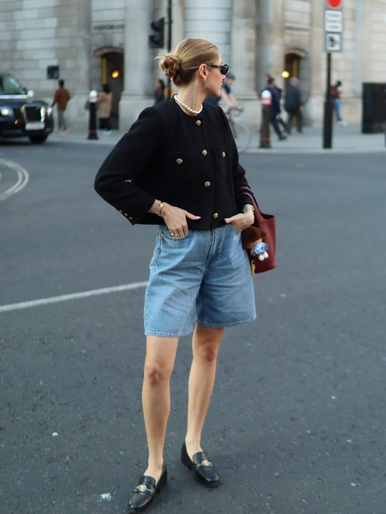 This look brings a chic blend of refinement and ease—the boxy black jacket, gold buttons, and long denim shorts feel classic yet fashion-forward. There’s a quiet strength to the outfit, a sense of effortless poise that works beautifully for city days when you want to feel structured without being too formal. The pearls add a timeless detail, making the whole combination feel elevated and gracefully modern.