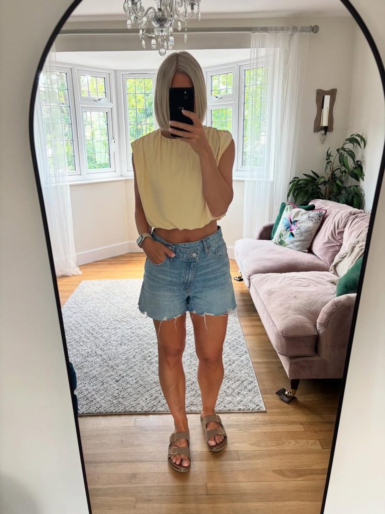 This look radiates breezy, sunny-day charm—the soft yellow top and relaxed denim shorts create a light, cheerful vibe that feels perfect for easy summer living. There’s a playful simplicity here that feels refreshing and wonderfully effortless, especially for women who love comfortable, casual pieces that still look thoughtfully styled.