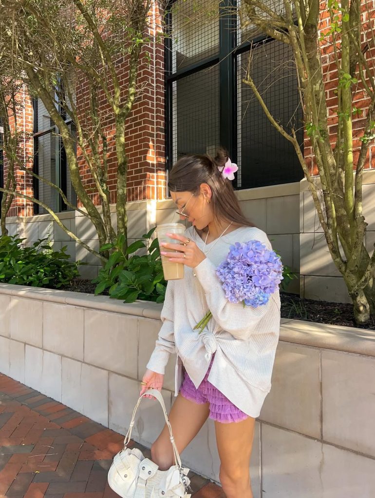 What makes this look stand out is its comforting vibe. The sweater feels inviting and warm, while the purple shorts add personality and texture. It’s a delightful 2026 choice for casual outings, coffee breaks, or any moment when you want to look cute and feel completely at ease.