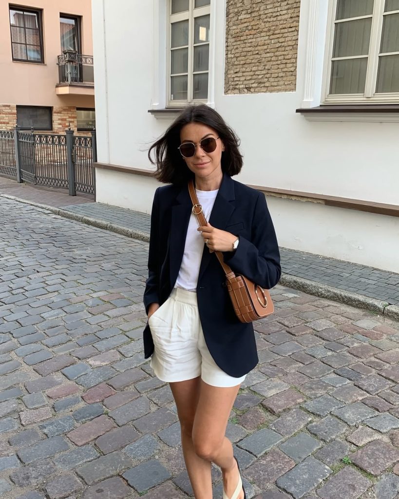 26. Navy Blazer With Soft White Tailored Shorts