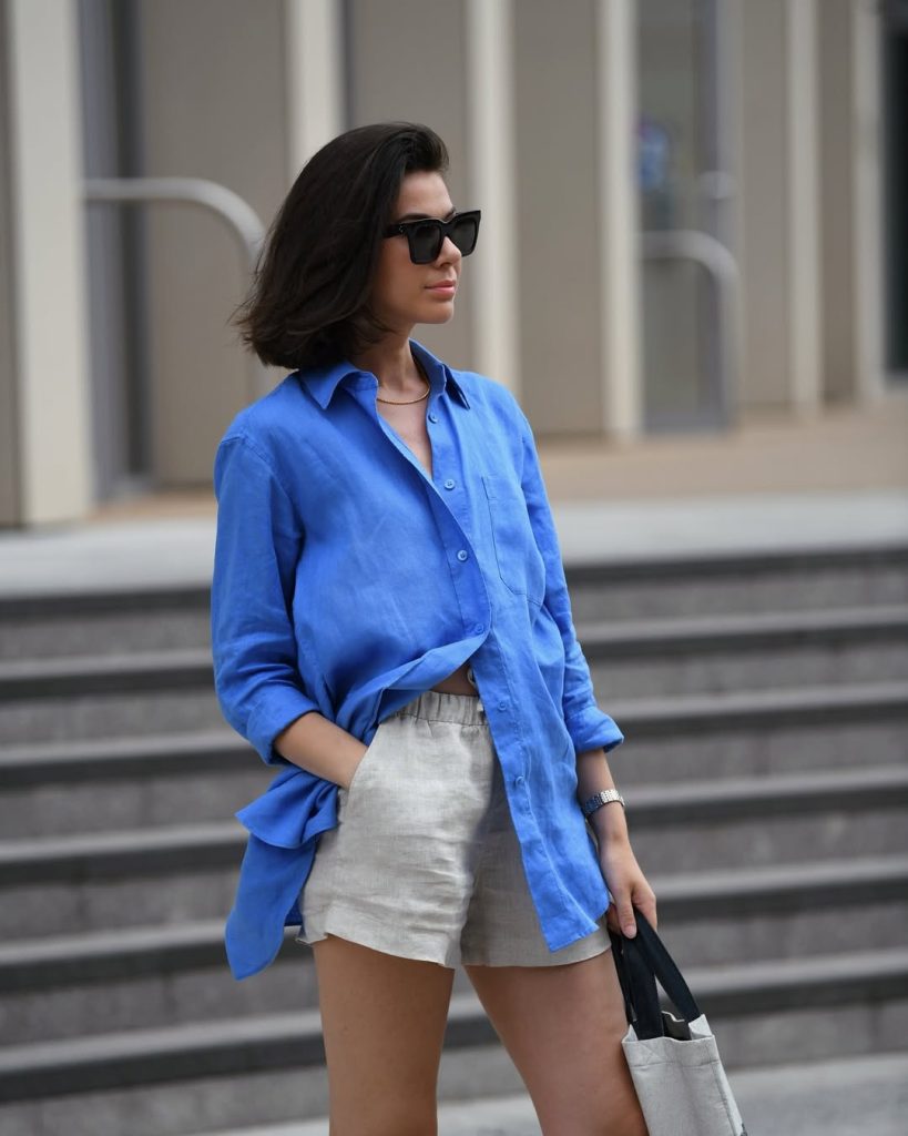 27. Oversized Blue Button-Down With Natural Linen Shorts