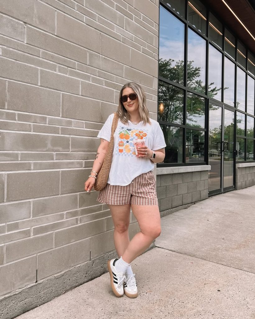 There’s a playful, relaxed energy to this outfit—the graphic tee, striped shorts, and retro sneakers create a fun weekend vibe that feels carefree and approachable. It’s the kind of look you slip into on a day when comfort is the priority but you still want a touch of personality. The warm tones and soft shapes make this especially charming and perfect for easygoing summer moments.