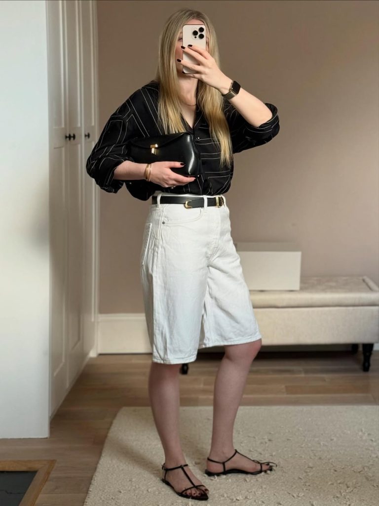 If you love low-maintenance styling, this outfit is a perfect go-to. The longer cut of the Bermuda is flattering, breezy, and simple to style with sandals, flats, or even dressy pieces. It’s the kind of look that stays timeless regardless of season but lands especially well in 2026 for its effortless casual elegance.
