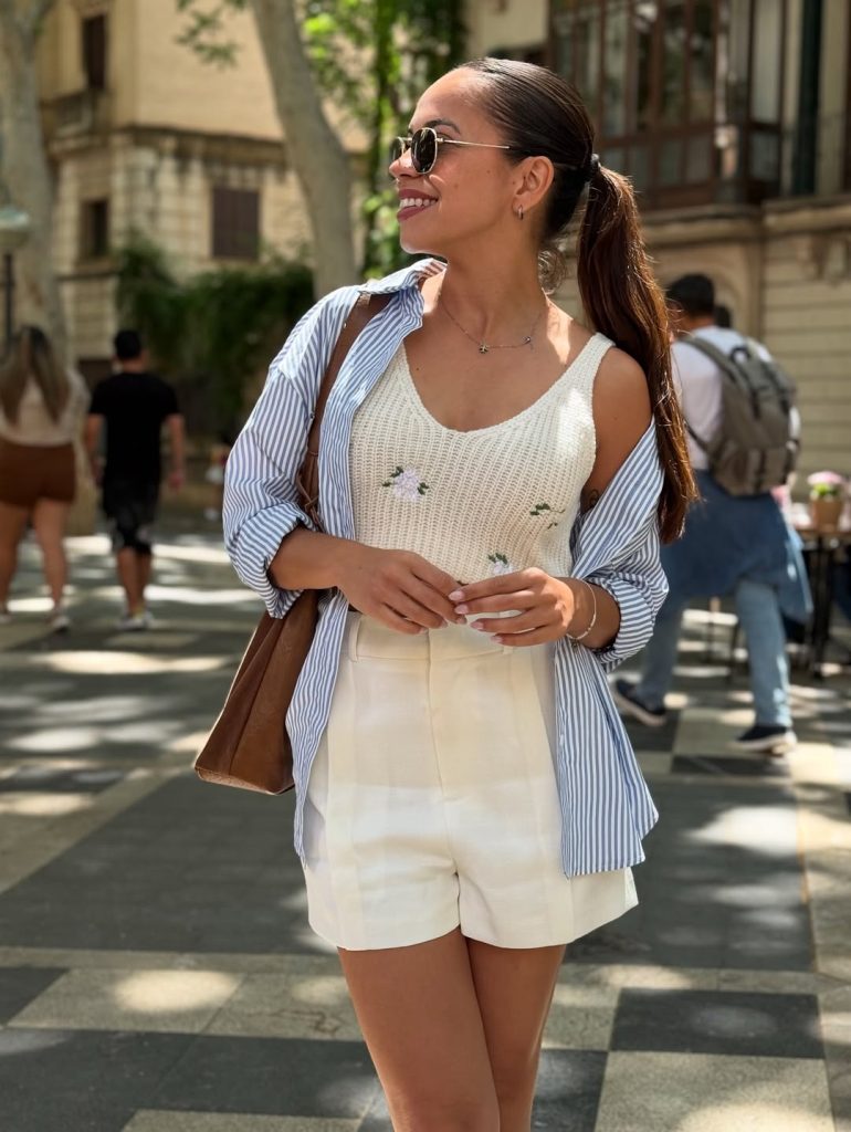 There’s something undeniably fresh about a soft tank paired with breezy cream shorts and a striped shirt worn open. It feels sunny, playful, and full of weekend energy—the kind of outfit that instantly lifts your mood. The delicate knit texture adds a feminine touch, while the loose layers give the whole look an easygoing charm that fits beautifully into a warm summer afternoon.