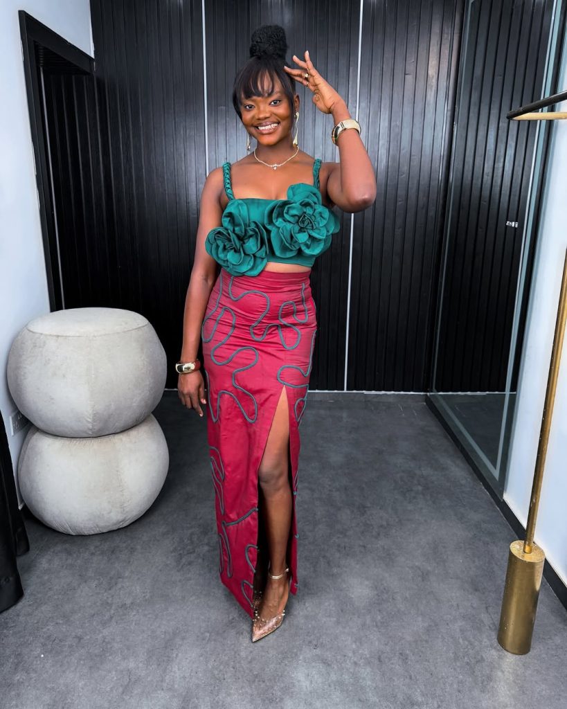 1. Emerald Floral Crop Top With Red Statement Skirt
