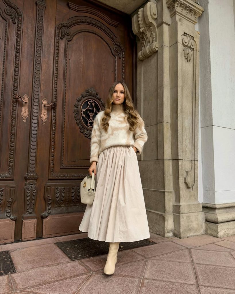 12. Cream Maxi Skirt With Cozy Patterned Sweater