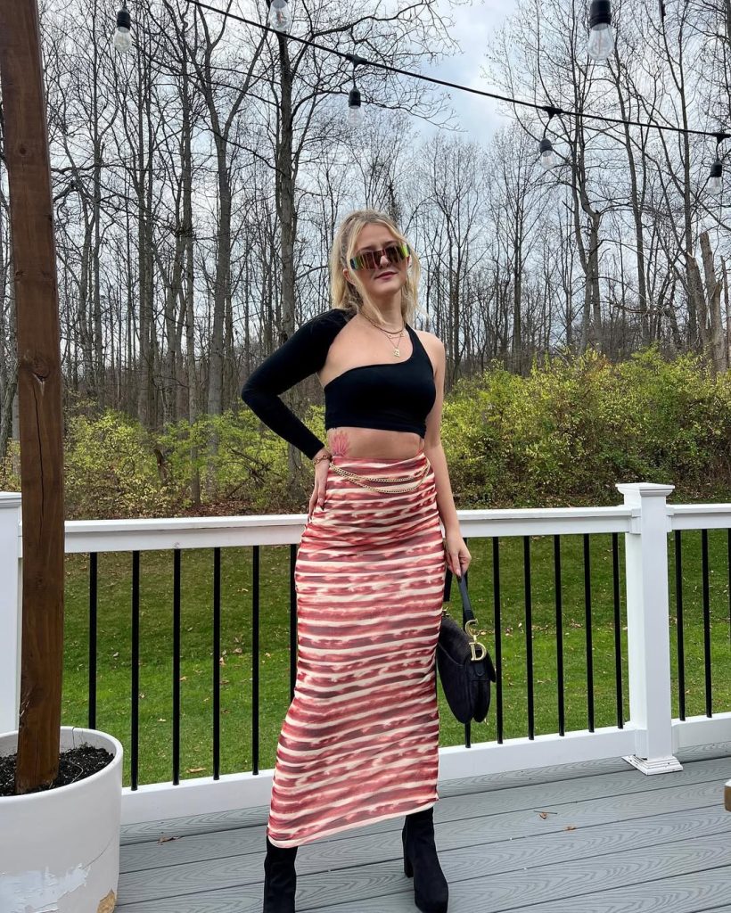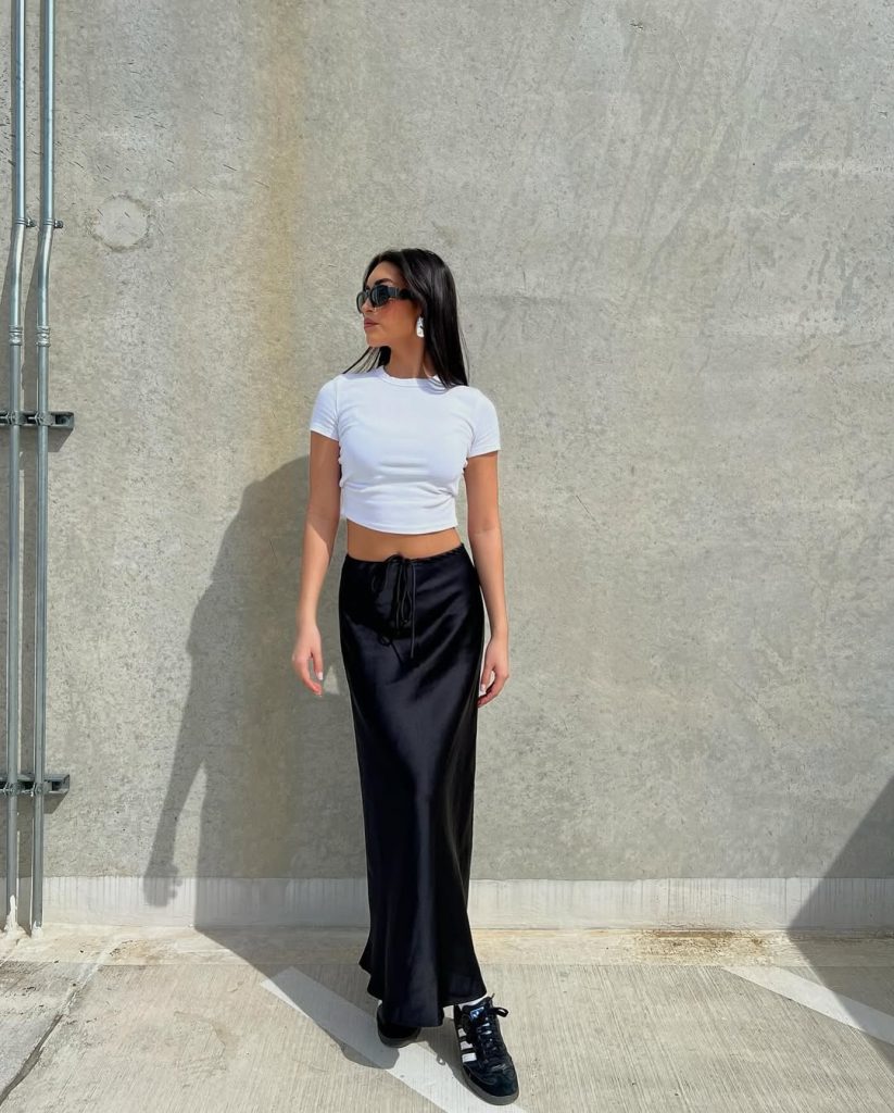 This is one outfit that exudes pure and utter fashion sophistication and modernity. The white crop top is so elegant and sporty with its clean lines, and then, of course, there is the ultimate elegance exuded by the black satin maxi skirt, which flows and shines with every step.
