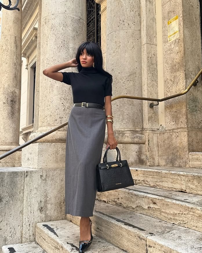 If you love timeless pieces such as black maxi dresses or grey business suits, this pairing is sure to be right up your alley. The long skirt creates a slimming effect and matches well with pointed heels. A tailored handbag pulls the entire look together, making it ideal for office meetings, city events, and winter dressing.