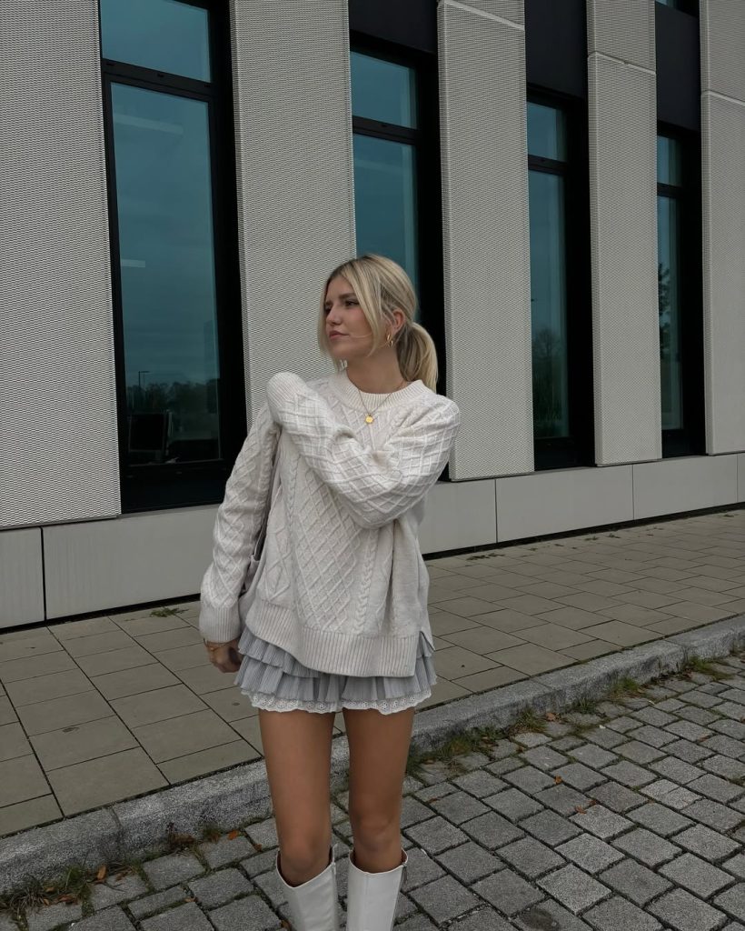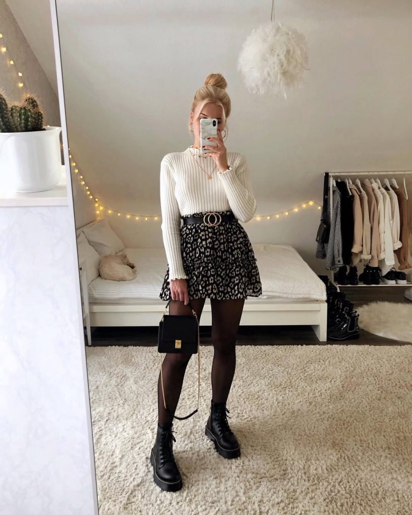 This outfit offers a delightful combination of softness and toughness. The olive sweater hugs your body with warmth and sophistication, and your outfit goes from sweet and girly to rock ‘n’ roll with the white mini skirt and statement boots.