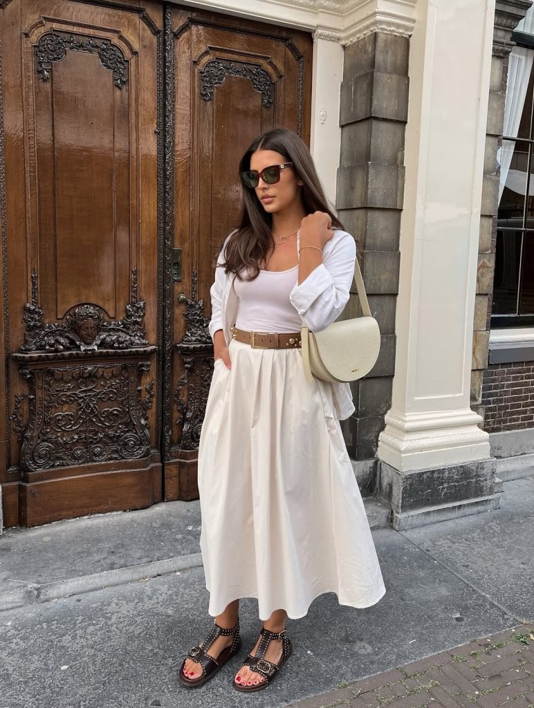This outfit exudes such beautiful ease—all clean lines, neutral tones, and an effortlessly airy style that’s so easy to love and replicate. The white maxi skirt provides beauty with its movement, and it pairs so well with the tank and open shirt, creating such beauty with its relaxed and elegant style.