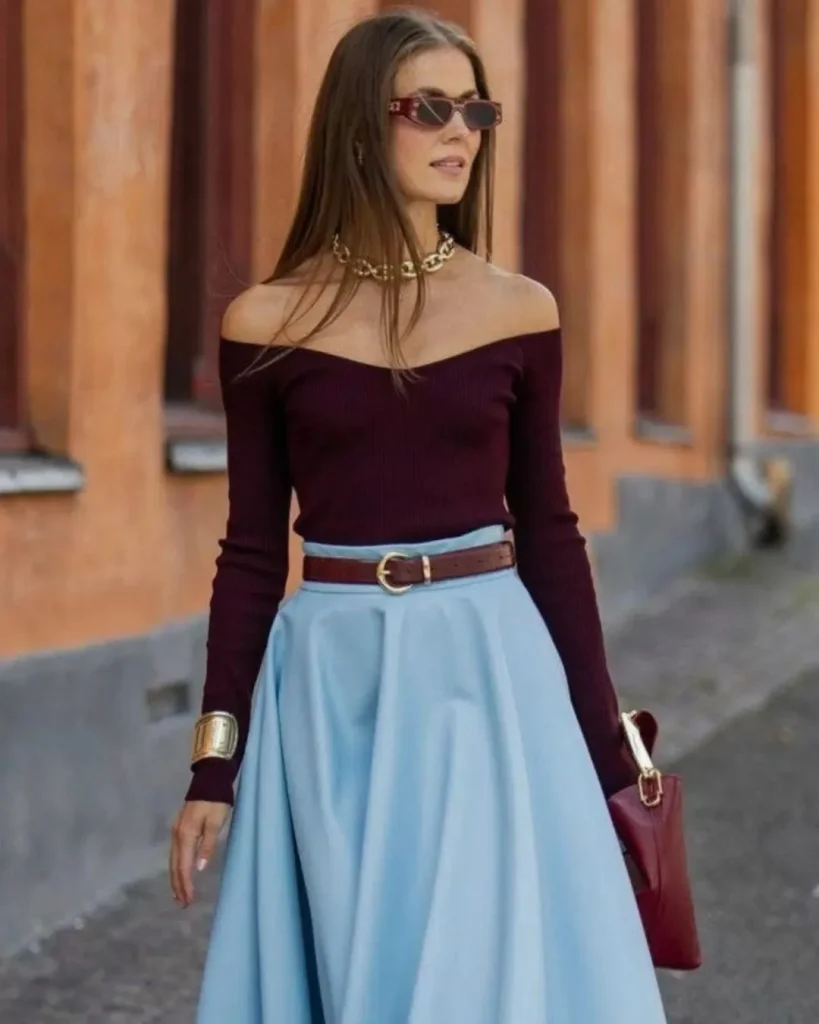 19. Off-Shoulder Burgundy Top With Sky Blue Midi Skirt