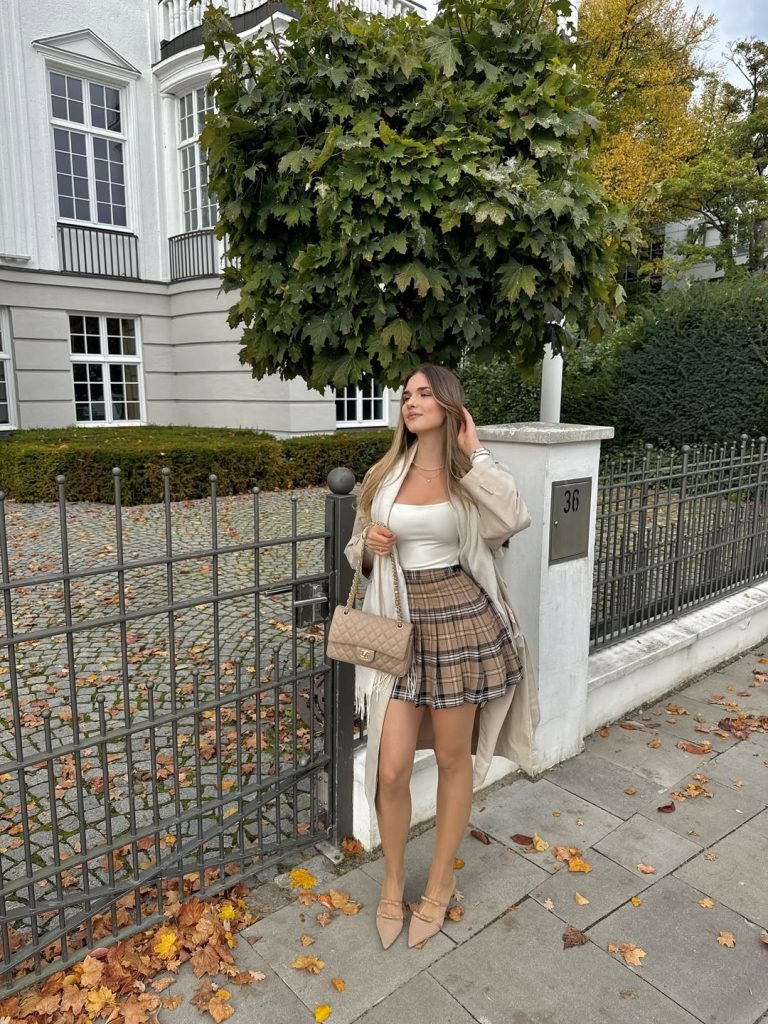 2. Plaid Mini Skirt With Cream Top and Long Coat