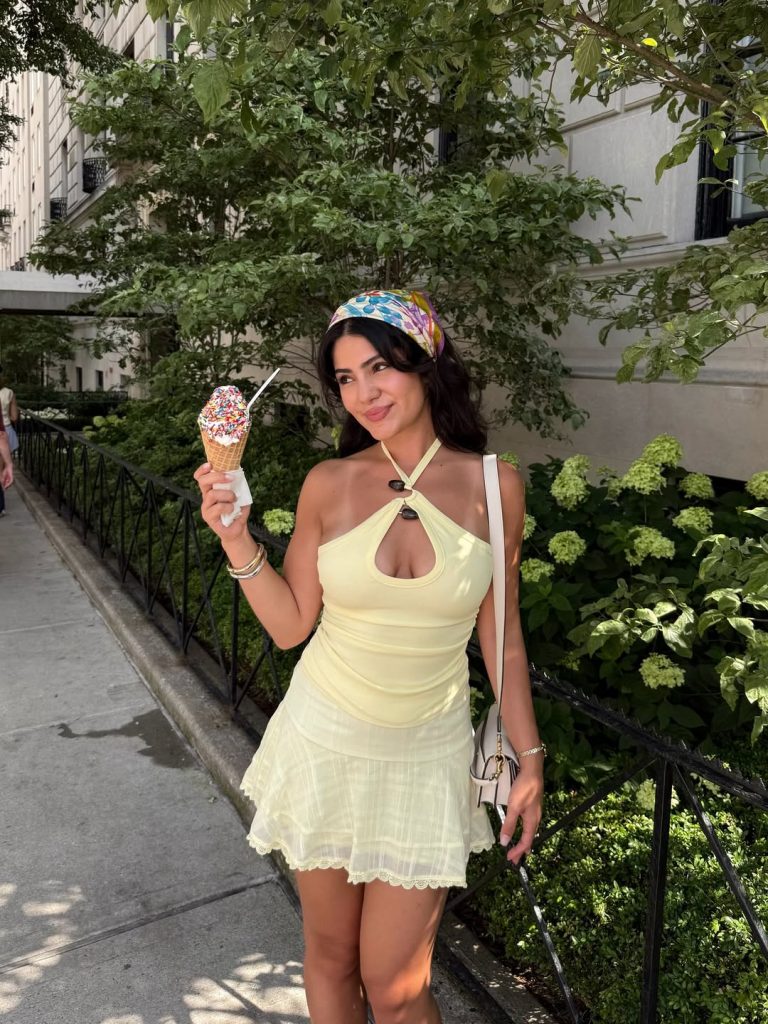The mini skirt slims and lengthens legs wonderfully, and its fabric flows effortlessly all day long. You can pair it with sandals if you are going for a relaxed, summery vibe or with white sneakers if you’re after something adorable and functional for warmer afternoons.
