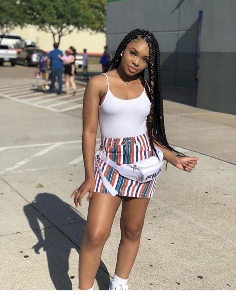 There’s something so endlessly fun and exciting about this colorful striped mini skirt. The vibe it exudes is that of a bright and beautiful day, with plans that involve living in the moment and an overall feeling of presence and joy. The white tank does nothing but add to this effect and enhance its bright coloration.
