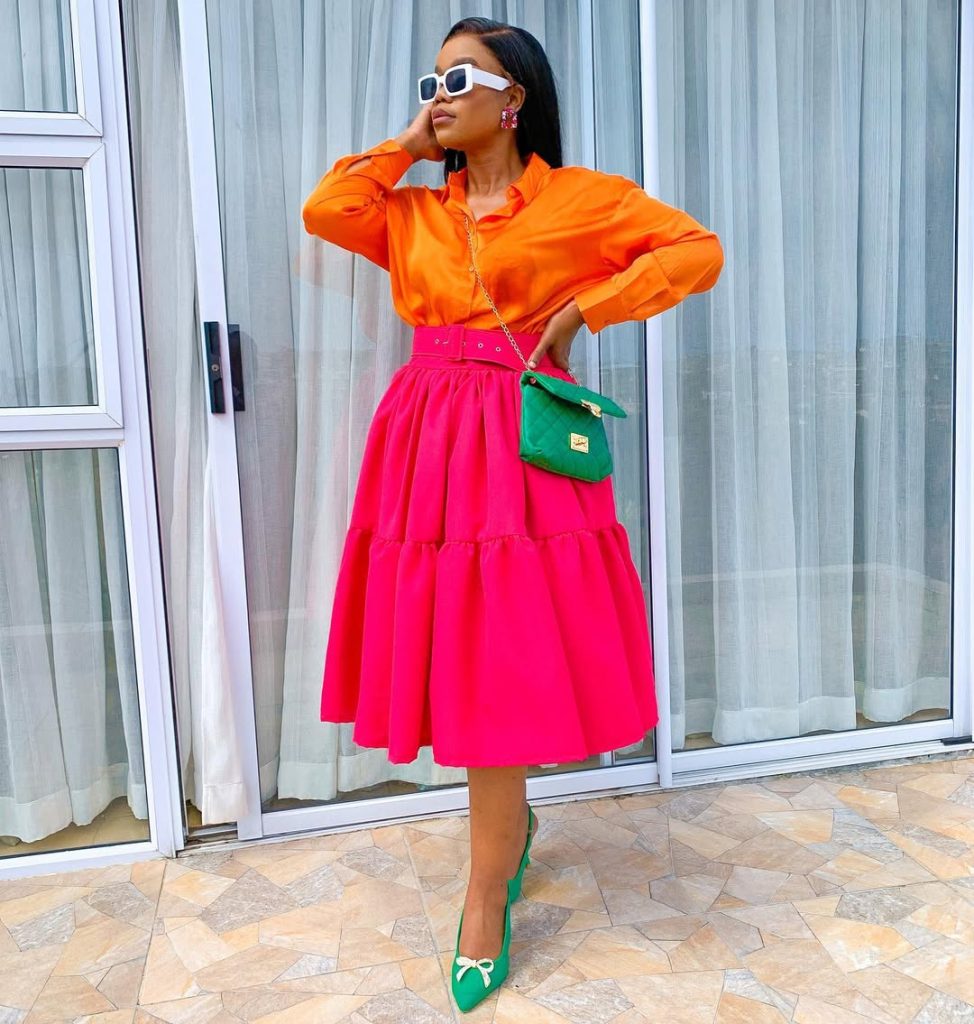 This one’s all about exuding pure confidence color-wise. This hot pink midi skirt moves with so much life, and then you get this bright orange shirt with so much attitude, and it’s all so mood-boosting and effortlessly confident and full of attitude and doesn’t say anything at all.