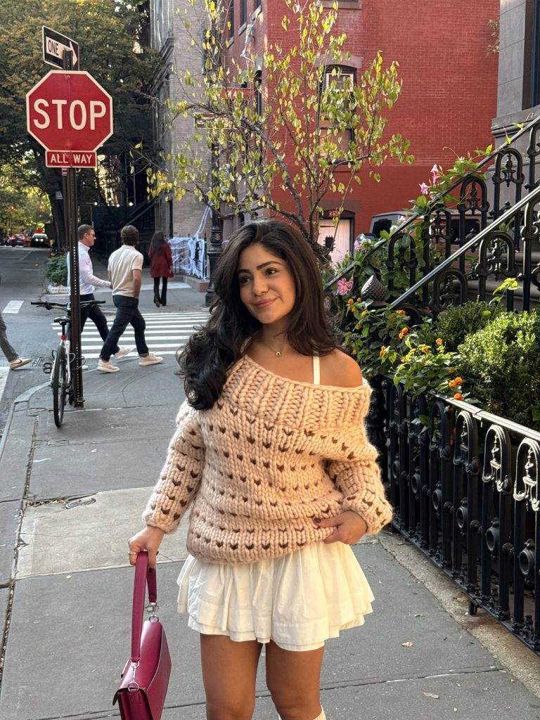 This outfit has that irresistibly cute-cozy factor—it’s like the first day of fall, and you get to break out your favorite knit sweater. The thick blush-colored knit sweater exudes warmth and has a whimsical, dreamy quality, while the white mini skirt has an airy, dancing quality that keeps all of this stylishly interesting. There is something so romantic and easy about this outfit, and it’s perfect for wandering around the city.