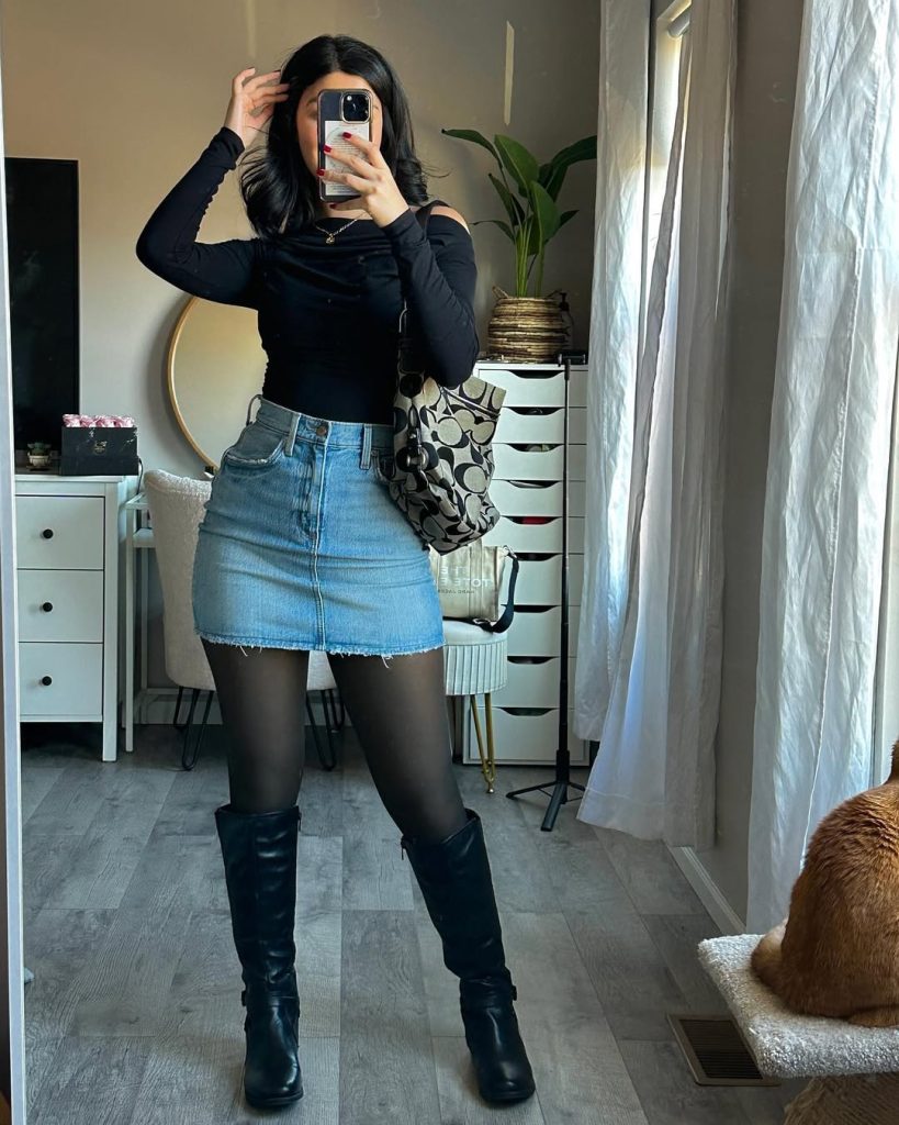 This outfit has that perfect laid-back, edgy style, with each item mixed and matched together in an organized fashion without overdoing it. The long-sleeved black shirt goes well with the denim mini skirt and offers the perfect amount of laid-back style. The addition of high boots gives your overall look poise and sophistication.