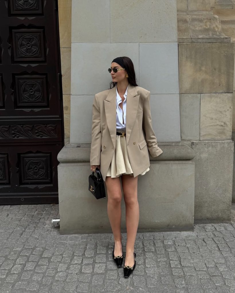 This outfit idea has all the markings of something you’d see in an actual fashion editorial—it’s structured, stylish, and exudes quiet confidence. The oversized beige blazer brings with it the dapper, interjecting dose of male sophistication, and then you’ve got the cream-colored pleated skirt that breaks things up with its fluidity and femininity.