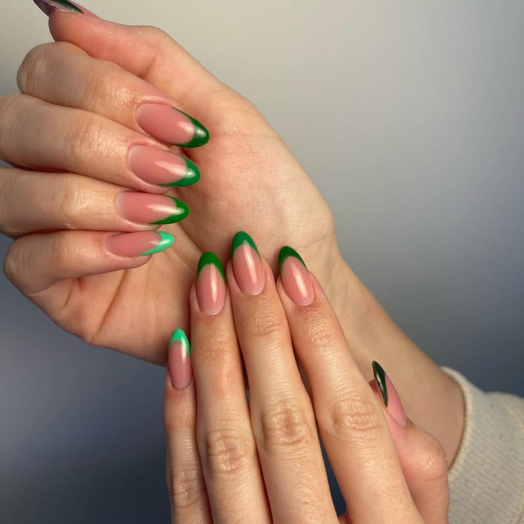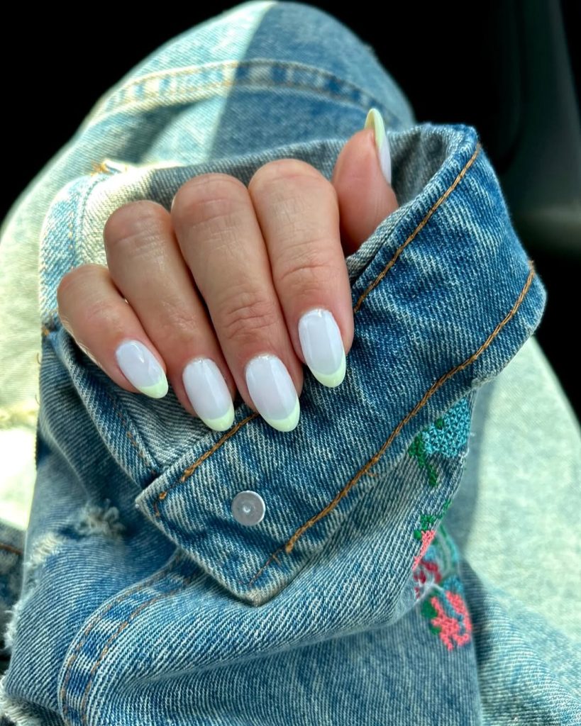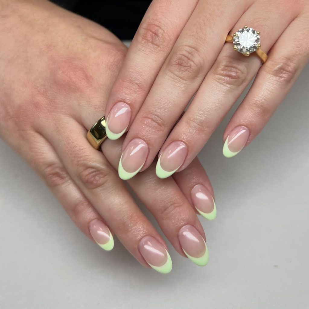These light green French tips have a refreshing calm elegance to them, and the shade is quite fresh and natural, like early spring. The look is soft and almond-shaped and quite graceful. It is minimal and effortless, and it is great for those who love understated styles.