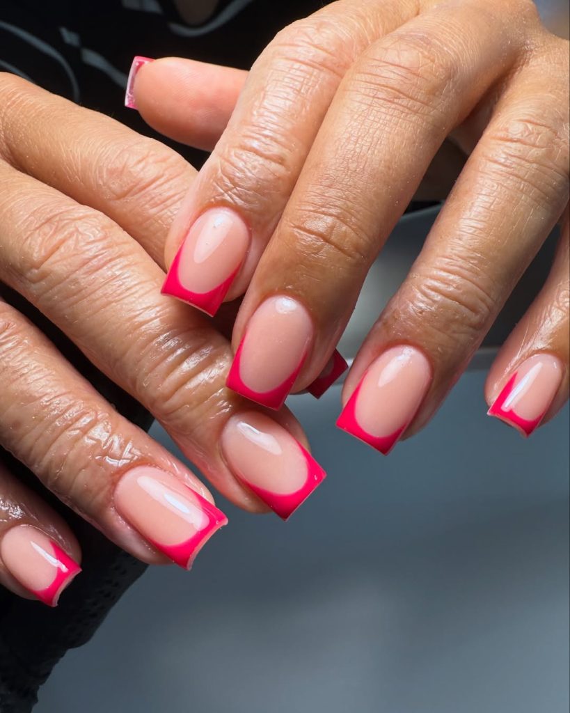 This manicure is a good option if you like short square nails and energetic colors. Square pink tips are especially flattering on wider nail beds and provide a clean, graphic look. If you are opting for whimsy over white, this design is even classy for 2026.