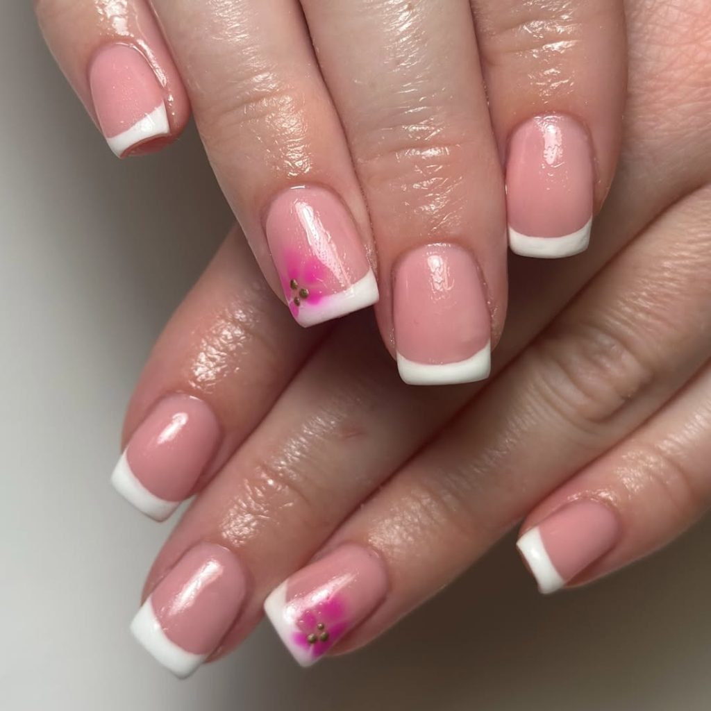 These nails combine classic elegance with a sweet spring detail. The crisp white French tips feel clean and familiar, while the tiny pink flowers add charm and personality. The overall look is gentle and cheerful, like a subtle nod to spring blossoms without being overly decorative.