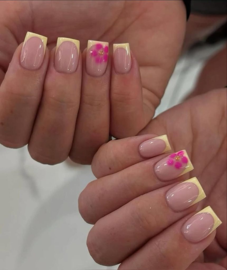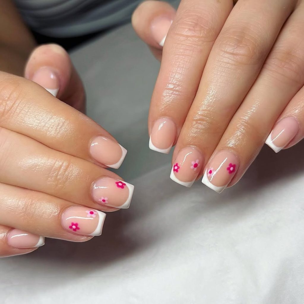 The design is perfect for those who appreciate a classy, timeless style that does not become outdated. It does a wonderful job ensuring the white tips contrast beautifully with the nail shape, and the small flower tips keep it more springy. Targeting the square short nails, this design is a win paired with a neutral outfit and soft makeup.
