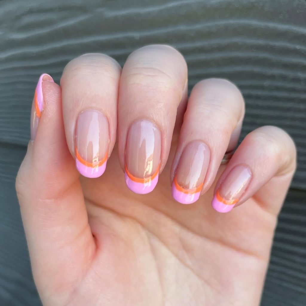 This French tip style feels playful and modern, with soft pink and orange lines layered delicately at the edge. The double-line detail adds interest without overwhelming the nail, creating a look that’s bright, fresh, and full of spring energy. It feels youthful but still polished, making it easy to wear.